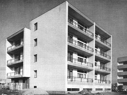 Az Óbudai Kísérleti Lakótelep "leghíresebb" háza, a korabeli publikációk ezt a képet közölték, amikor beszámoltak a telepről. Az épület tervezője Minary Olga, az első női Ybl-díjas építész.