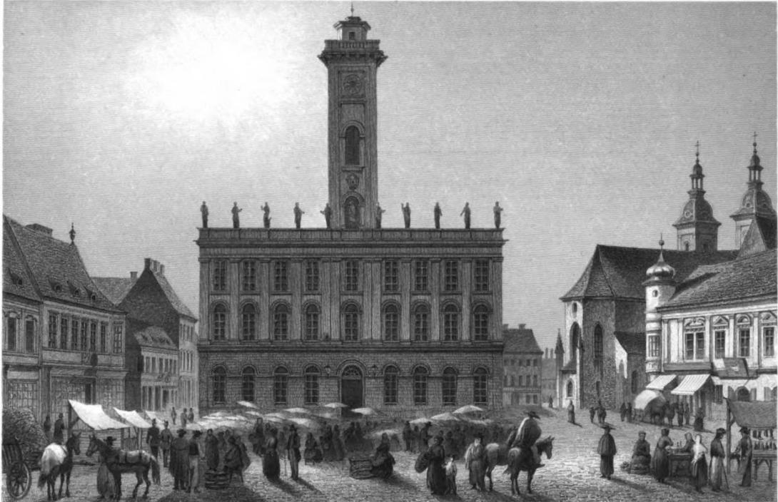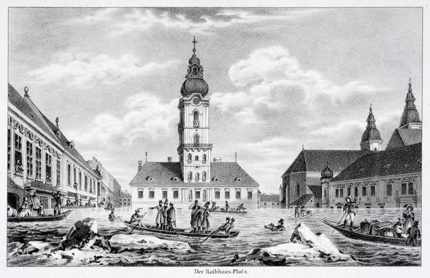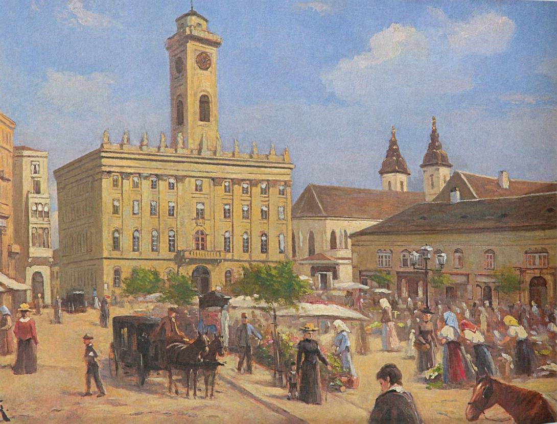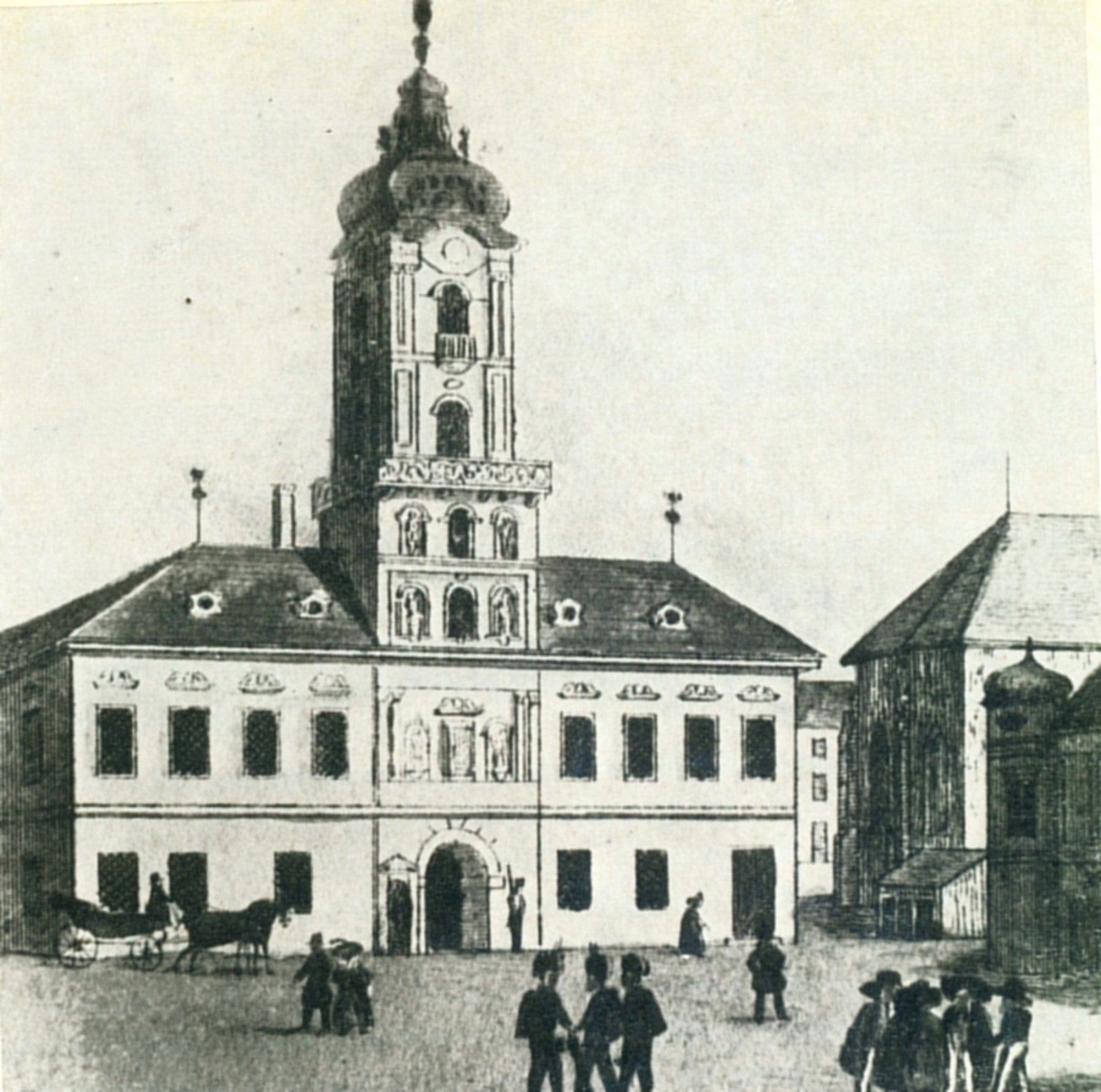 A török uralom után, a plébániatemplom mögött, meglévő épületek összevonásával és átépítésével, torony építésével hozták létre 1702-1710 között a pesti Városházát. A kép az 1700-as évek második felében lévő állapotát mutatja.