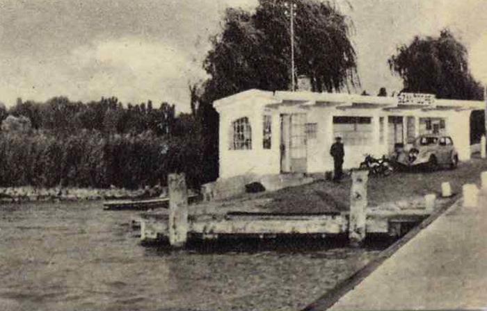 "1802 tavaszán megépítetek a révhajó mólóját, kikötőjét. A part menti töltés hossza közel 200 méter lett. A révek növekvő forgalma, a megnagyobbodott utasforgalom egy révcsárda építését követeli: 1839-1840-ben építették a szántódi révcsárdát, amely a mai napig is áll, és fogadja a vendégeket,1848-ban a révet bekapcsolták a postai forgalomba. A révcsárda előtt állt meg a postakocsi, itt kellett Veszprém felé átszállni. A Déli Vasút megépítése (1861), a XX. század első évtizedei a Balaton környék életének lendületes fejlődését hozták. Ez a fejlődés nem érintette a révek világát. Változatlanul a fakomp közlekedett, az evezők mellett az apátság cselédei ültek." Forrás: Zákonyi Ferenc: A szántódi rév története